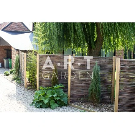 Ce panneau claustra noisetier , prêt à l’emploi, est essentiellement composé de branches de noisetier tressées en horizontal à la main. Les lames de bois qui le constituent sont en effet entrecroisées et s’emboitent suivant une technique qui permet d’obtenir un claustra brise-vue très esthétique. Fixé sur des poteaux non rainurés et soutenu par un cadre lui-même relié à deux poteaux, le panneau claustra est à la fois solide et léger compte tenu des propriétés du noisetier.